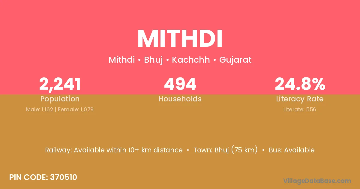 Bhuj (75 km) is the nearest town to Mithdi village for major economic activities and is located approximately 75 km away.