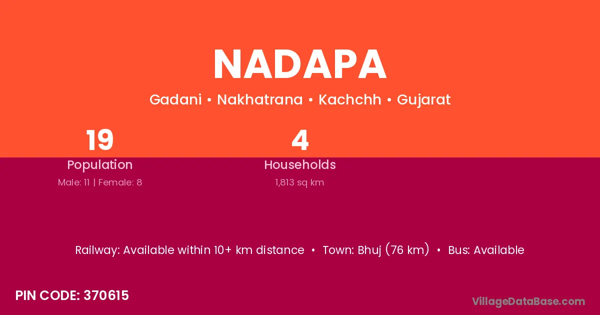 Bhuj (32 km) is the nearest town to Nadapa village for major economic activities and is located approximately 32 km away.