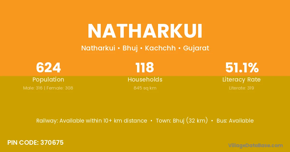 Bhuj (32 km) is the nearest town to Natharkui village for major economic activities and is located approximately 32 km away.