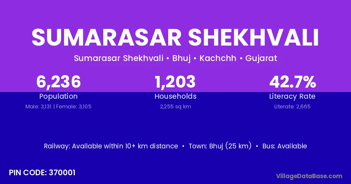 Bhuj (25 km) is the nearest town to Sumarasar Shekhvali village for major economic activities and is located approximately 25 km away.