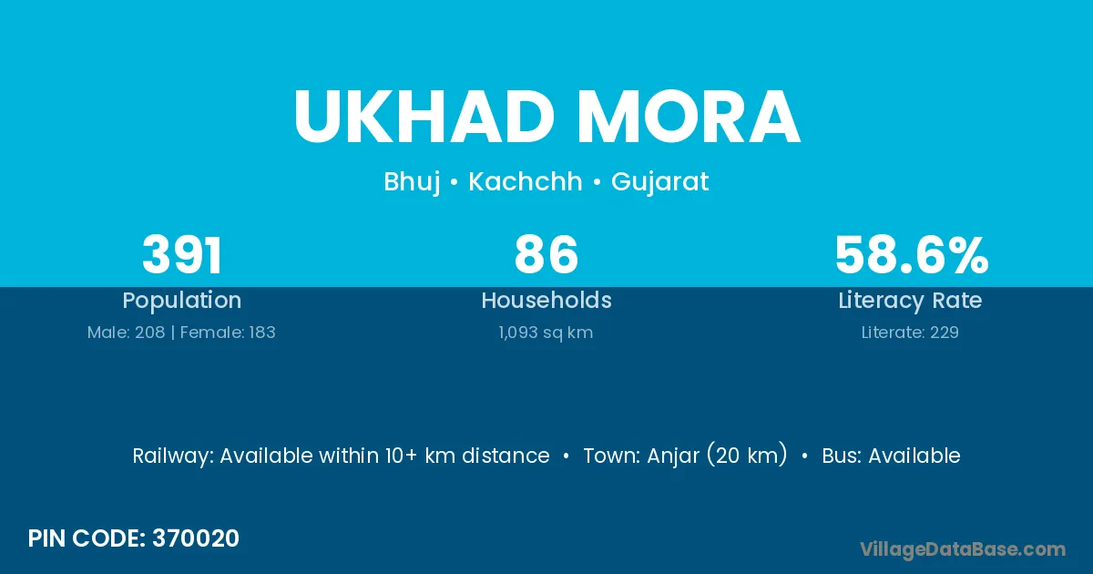 Anjar (20 km) is the nearest town to Ukhad Mora village for major economic activities and is located approximately 20 km away.