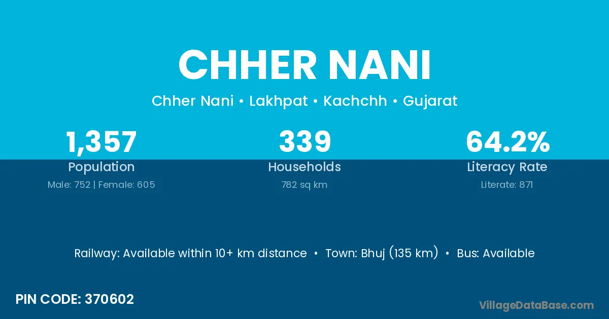Bhuj (135 km) is the nearest town to Chher Nani village for major economic activities and is located approximately 135 km away.