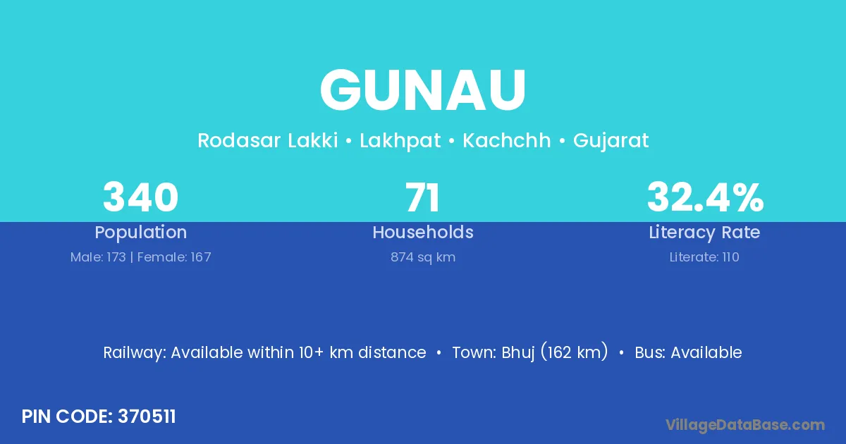 Bhuj (162 km) is the nearest town to Gunau village for major economic activities and is located approximately 162 km away.