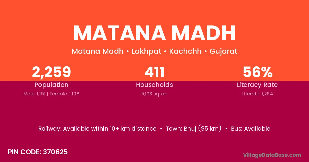 Bhuj (95 km) is the nearest town to Matana Madh village for major economic activities and is located approximately 95 km away.