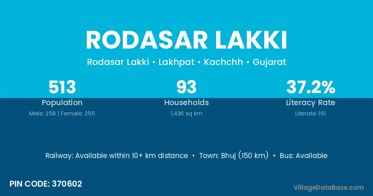 Bhuj (150 km) is the nearest town to Rodasar Lakki village for major economic activities and is located approximately 150 km away.
