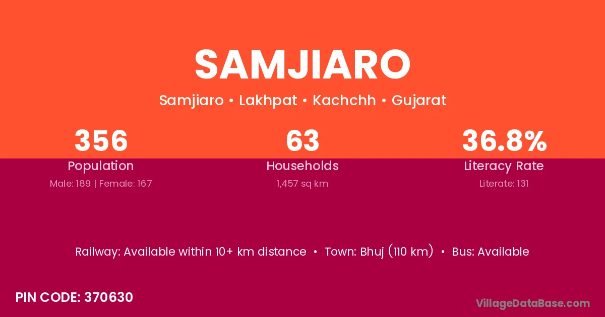 Bhuj (110 km) is the nearest town to Samjiaro village for major economic activities and is located approximately 110 km away.
