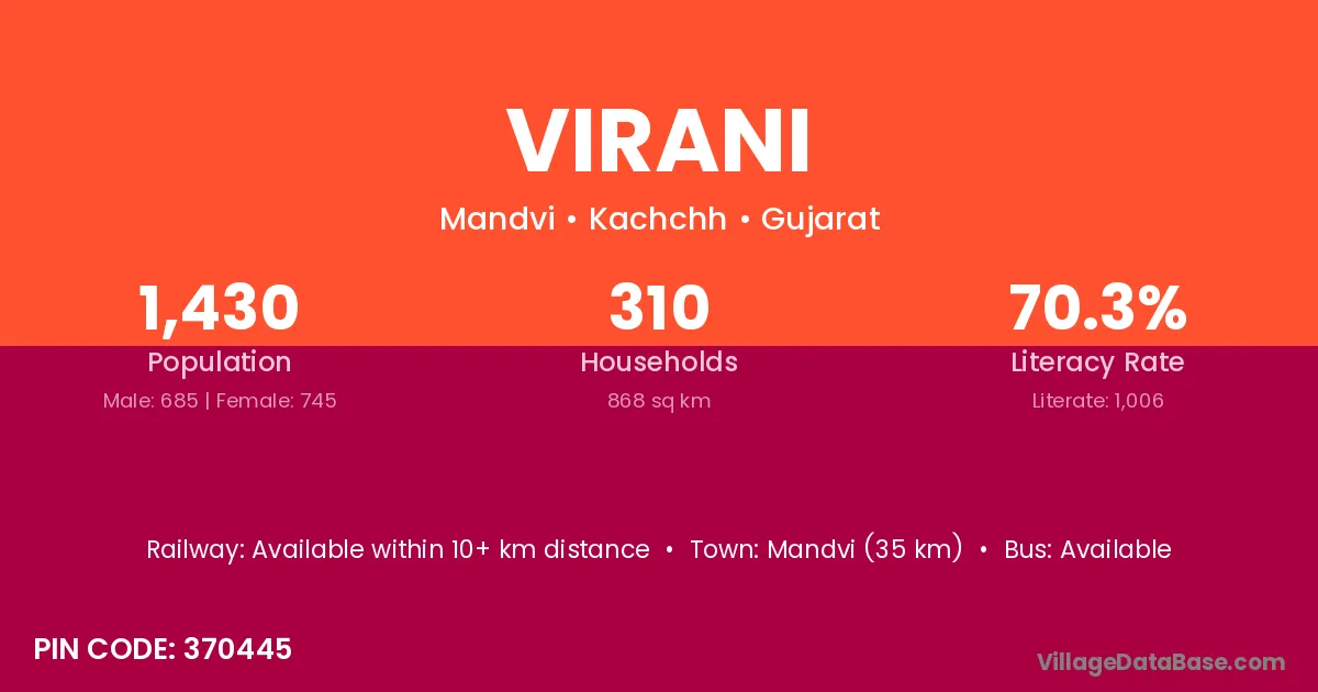 Bhuj (110 km) is the nearest town to Virani village for major economic activities and is located approximately 110 km away.