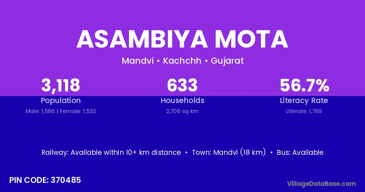 Mandvi (18 km) is the nearest town to Asambiya Mota village for major economic activities and is located approximately 18 km away.