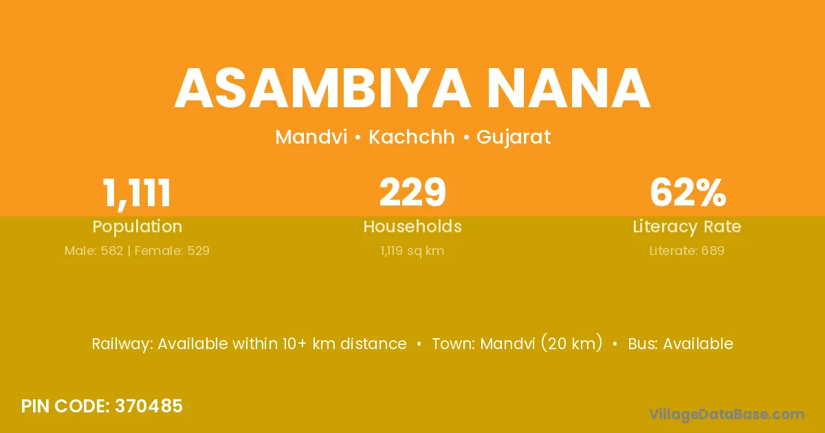 Mandvi (20 km) is the nearest town to Asambiya Nana village for major economic activities and is located approximately 20 km away.
