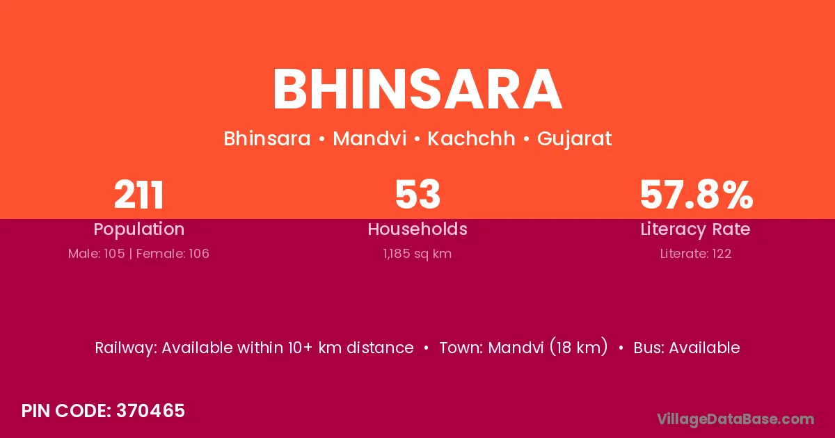 Mandvi (18 km) is the nearest town to Bhinsara village for major economic activities and is located approximately 18 km away.