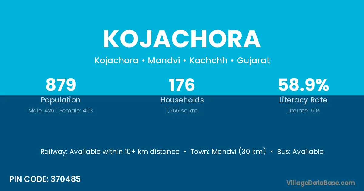 Mandvi (30 km) is the nearest town to Kojachora village for major economic activities and is located approximately 30 km away.