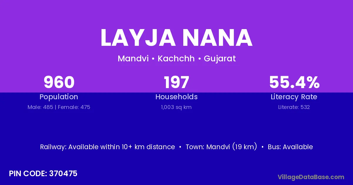 Mandvi (19 km) is the nearest town to Layja Nana village for major economic activities and is located approximately 19 km away.