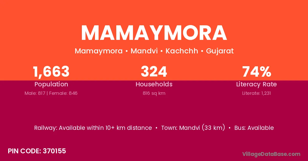 Mandvi (33 km) is the nearest town to Mamaymora village for major economic activities and is located approximately 33 km away.