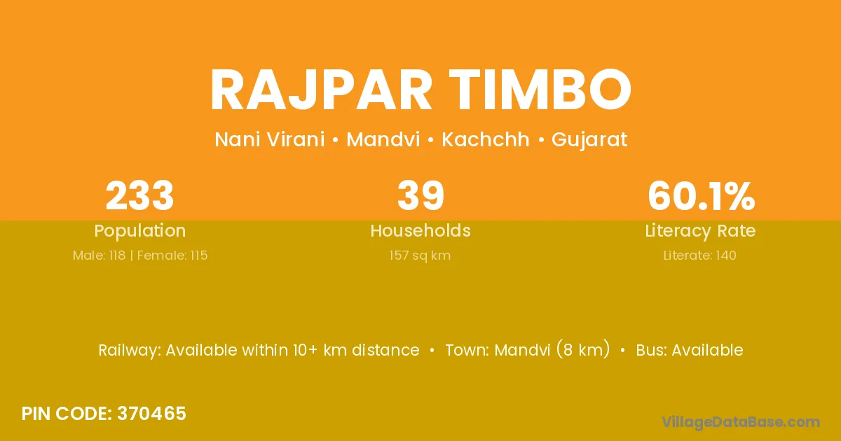 Rajpar Timbo village has a total population of 233 people, of which 118 are males and 115 are females.