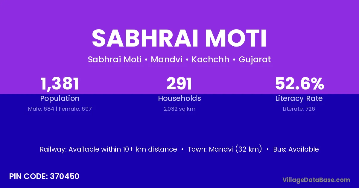 Mandvi (32 km) is the nearest town to Sabhrai Moti village for major economic activities and is located approximately 32 km away.