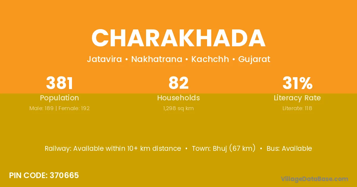 Bhuj (67 km) is the nearest town to Charakhada village for major economic activities and is located approximately 67 km away.