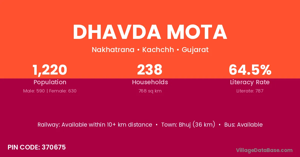 Dhavda Mota village has a total population of 1,220 people, of which 590 are males and 630 are females.