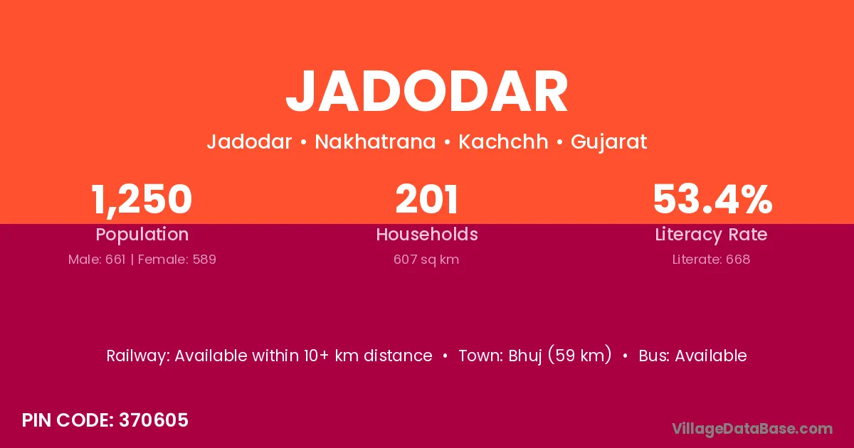 Bhuj (59 km) is the nearest town to Jadodar village for major economic activities and is located approximately 59 km away.
