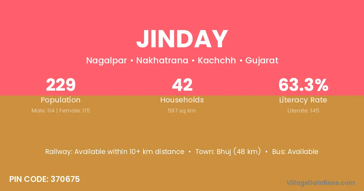 Bhuj (48 km) is the nearest town to Jinday village for major economic activities and is located approximately 48 km away.