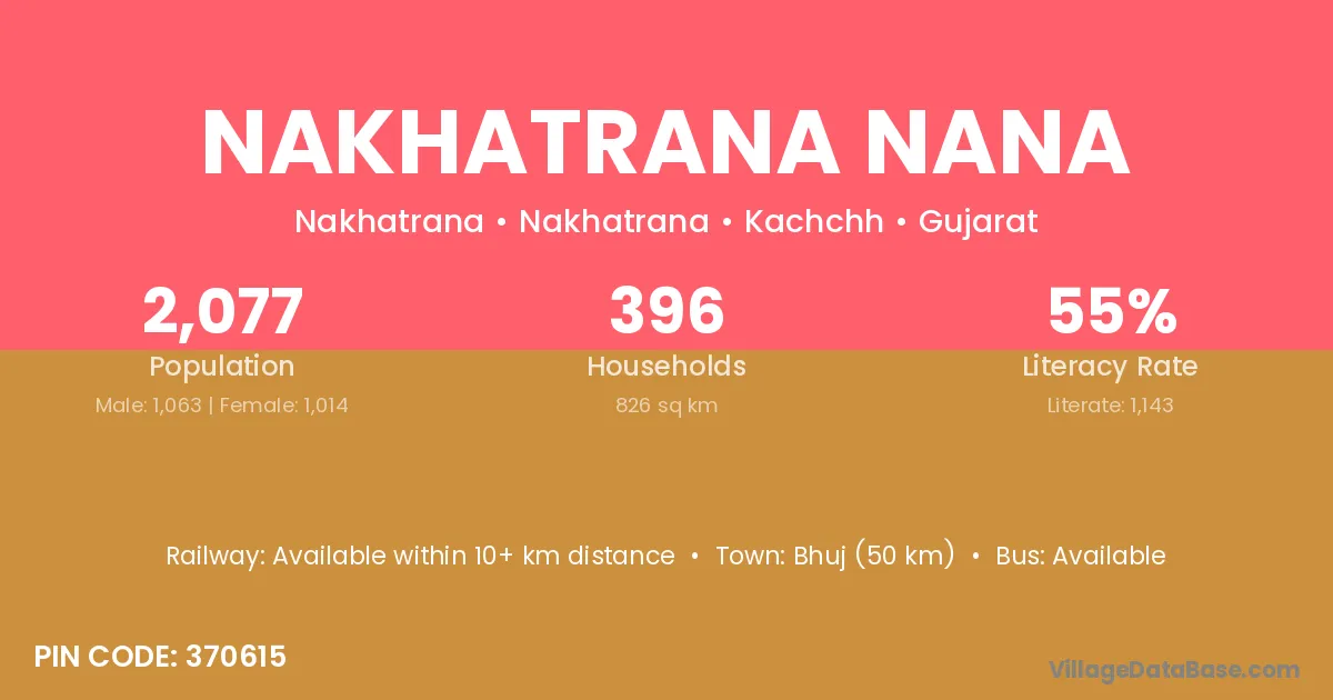 Nakhatrana Nana village has a total population of 2,077 people, of which 1,063 are males and 1,014 are females.