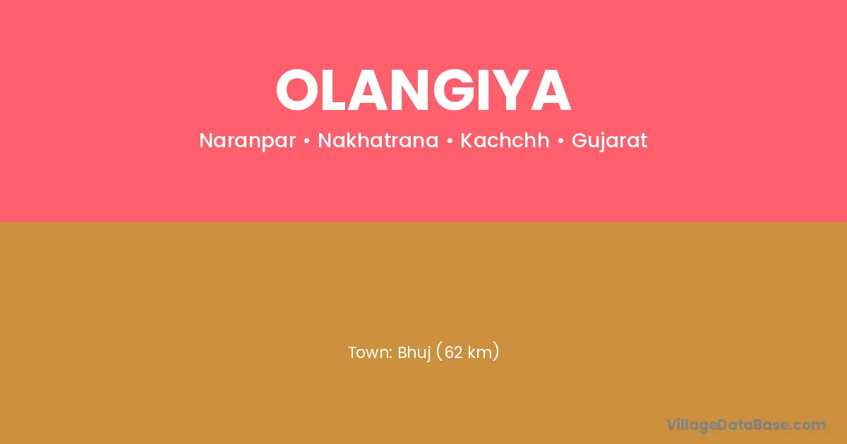 Bhuj (62 km) is the nearest town to Olangiya village for major economic activities and is located approximately 62 km away.