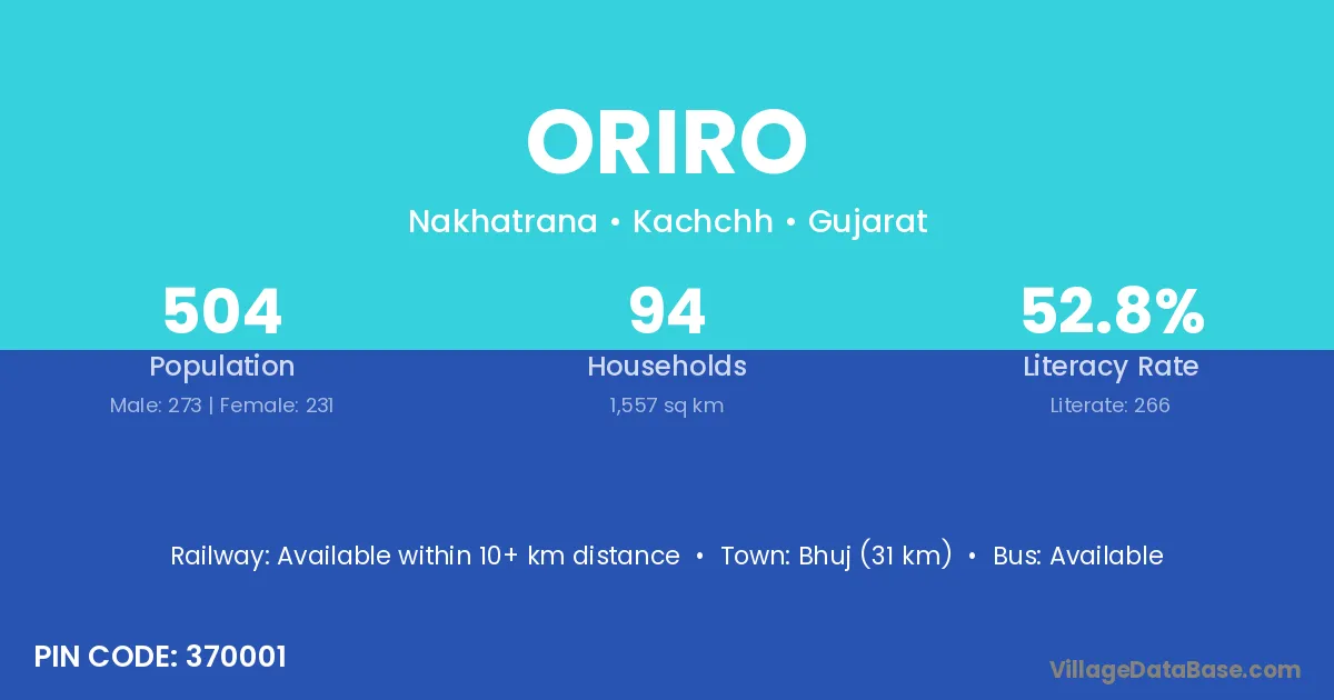 Bhuj (31 km) is the nearest town to Oriro village for major economic activities and is located approximately 31 km away.