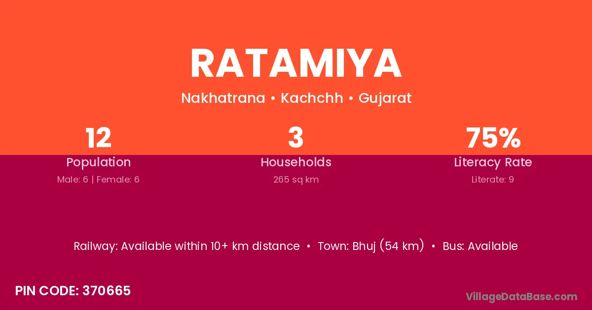 Ratamiya village has a total population of 12 people, of which 6 are males and 6 are females.