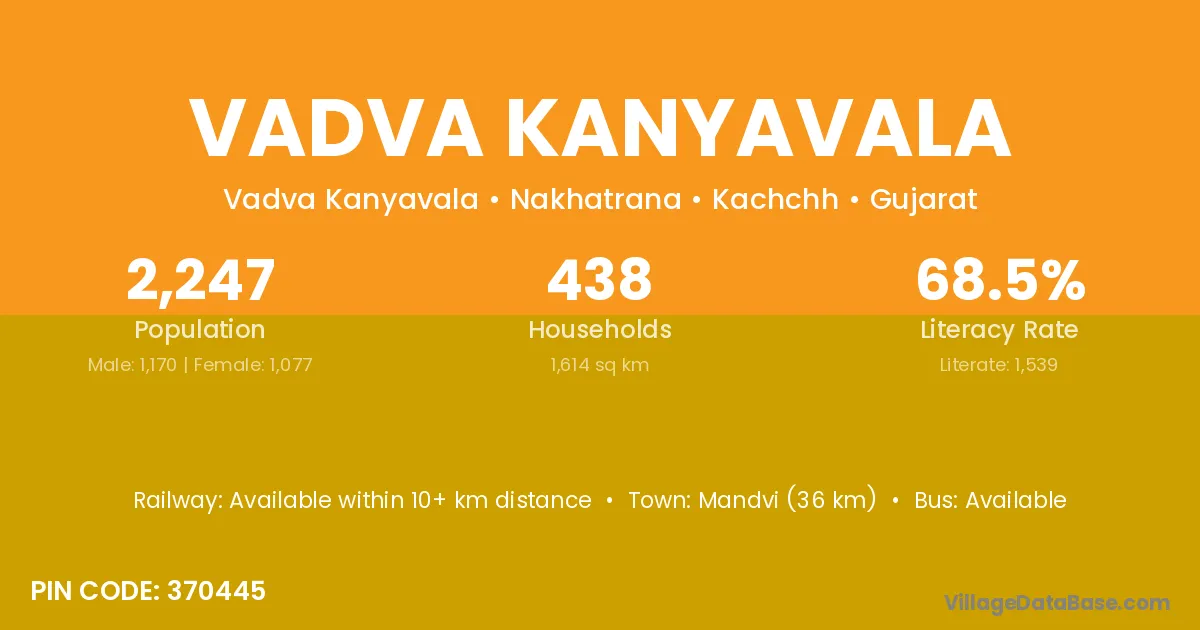 Mandvi (36 km) is the nearest town to Vadva Kanyavala village for major economic activities and is located approximately 36 km away.