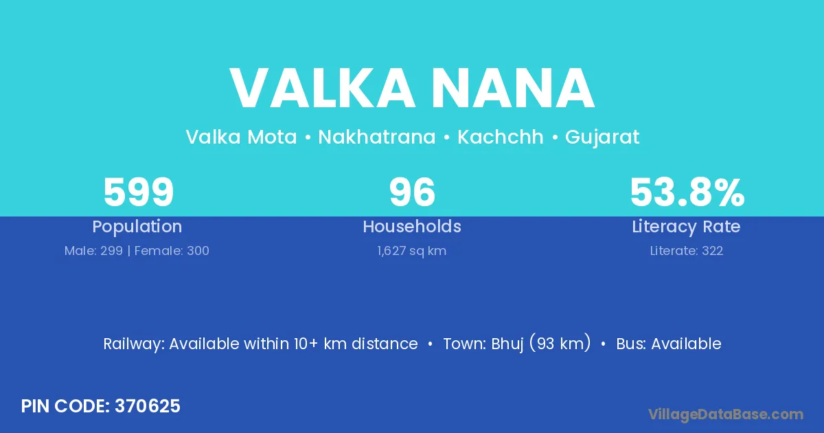 Bhuj (93 km) is the nearest town to Valka Nana village for major economic activities and is located approximately 93 km away.