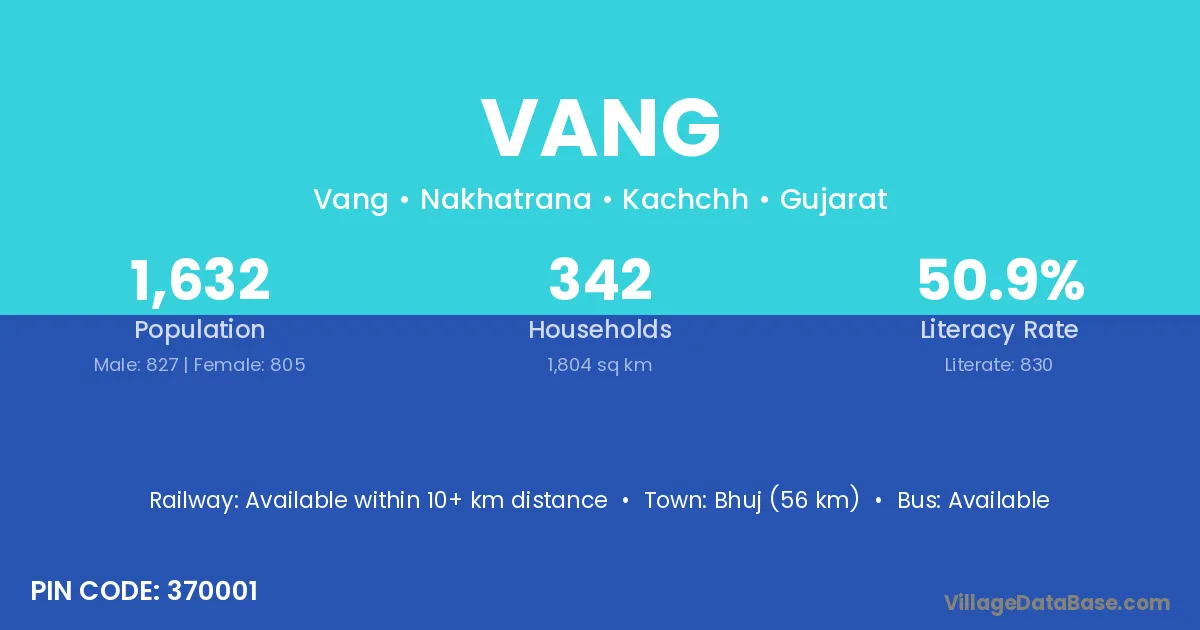 Bhuj (56 km) is the nearest town to Vang village for major economic activities and is located approximately 56 km away.