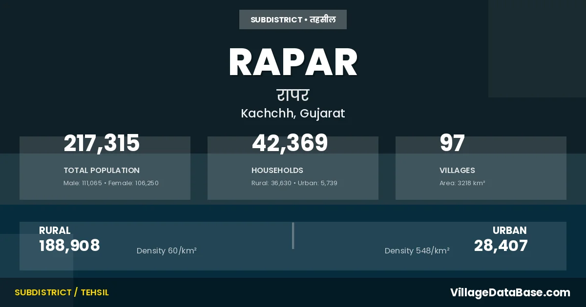 According to the 2011 census The total area of Rapar Taluka is 3218 km², with a population of 217315 people. The population density is 68 inhabitants per square kilometre, and there are approximately 42369 houses in the sub district.