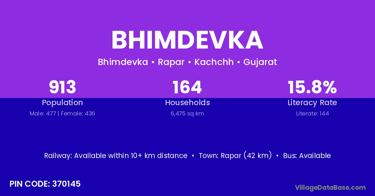 Rapar (42 km) is the nearest town to Bhimdevka village for major economic activities and is located approximately 42 km away.