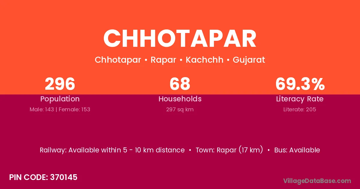 Rapar (17 km) is the nearest town to Chhotapar village for major economic activities and is located approximately 17 km away.