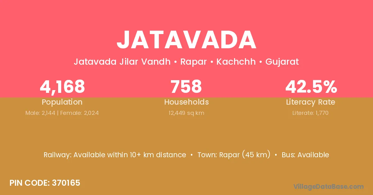 Rapar (45 km) is the nearest town to Jatavada village for major economic activities and is located approximately 45 km away.