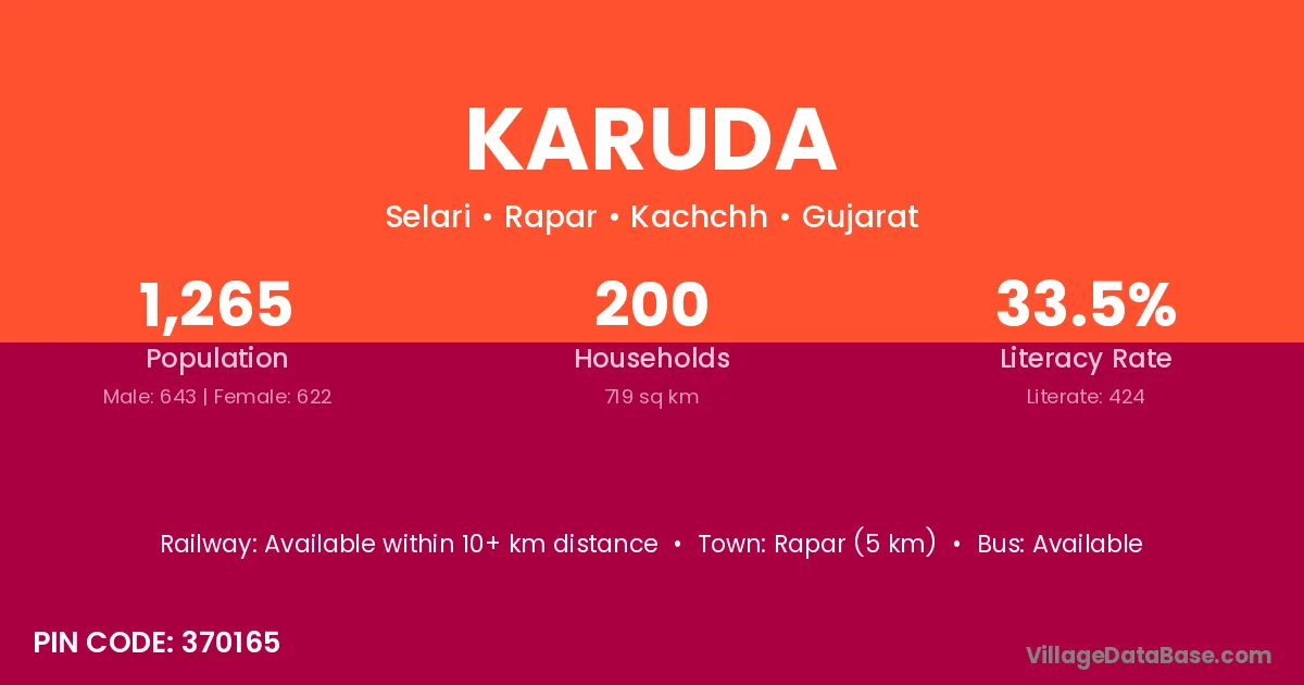Karuda village has a total population of 1,265 people, of which 643 are males and 622 are females.