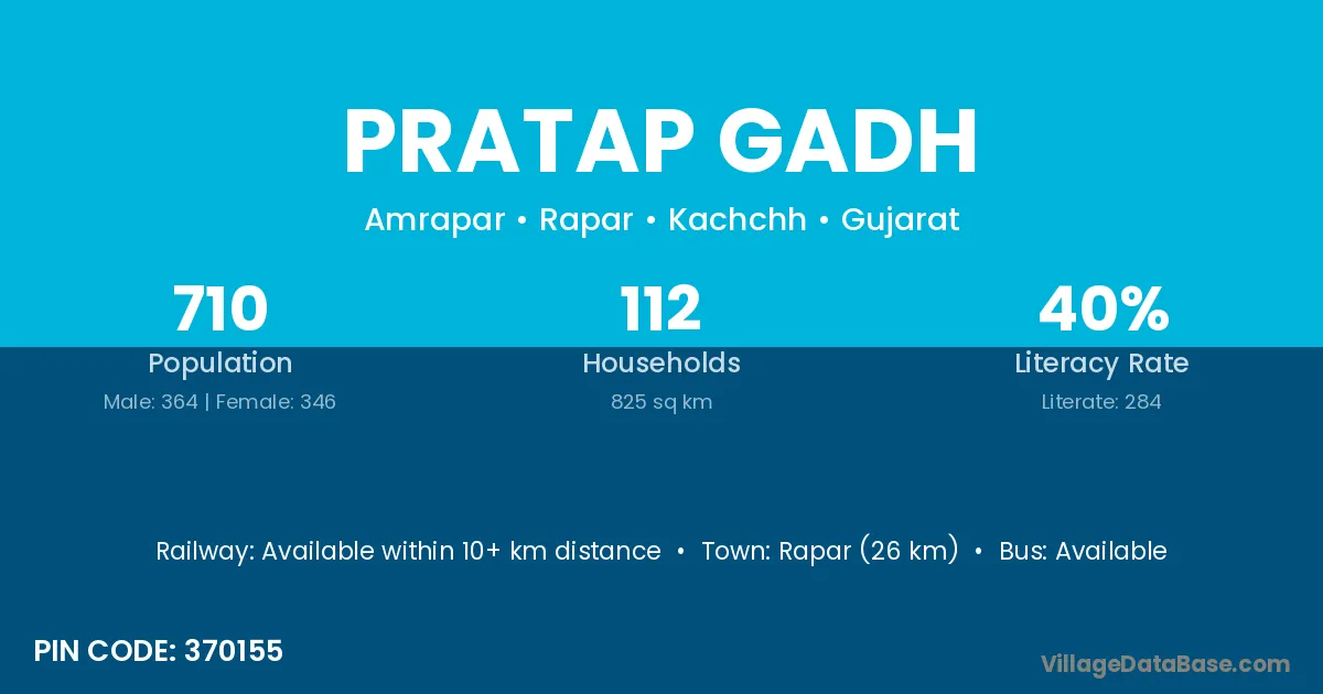 Rapar (26 km) is the nearest town to Pratap Gadh village for major economic activities and is located approximately 26 km away.