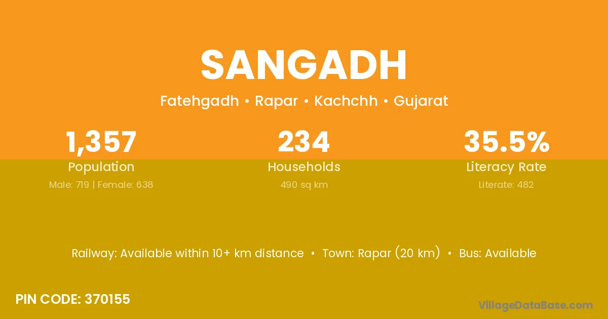 Rapar (20 km) is the nearest town to Sangadh village for major economic activities and is located approximately 20 km away.