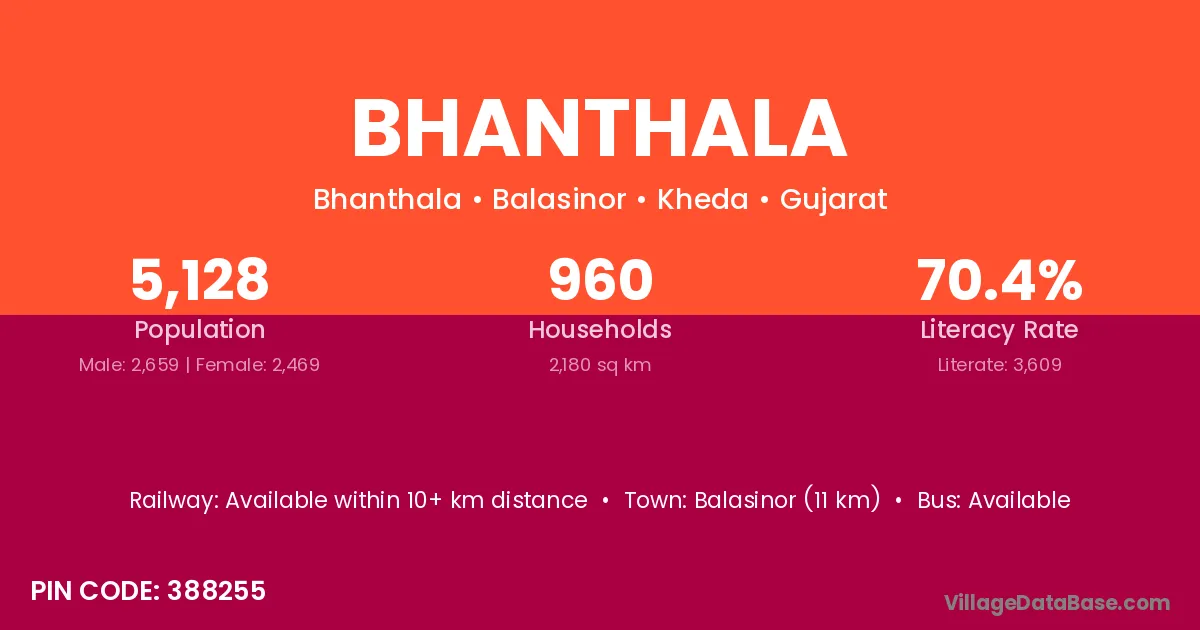 Balasinor (11 km) is the nearest town to Bhanthala village for major economic activities and is located approximately 11 km away.
