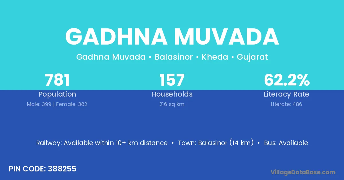 Balasinor (14 km) is the nearest town to Gadhna Muvada village for major economic activities and is located approximately 14 km away.