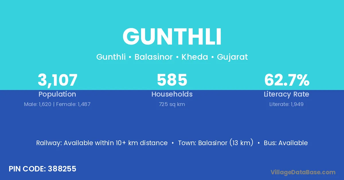 Balasinor (13 km) is the nearest town to Gunthli village for major economic activities and is located approximately 13 km away.