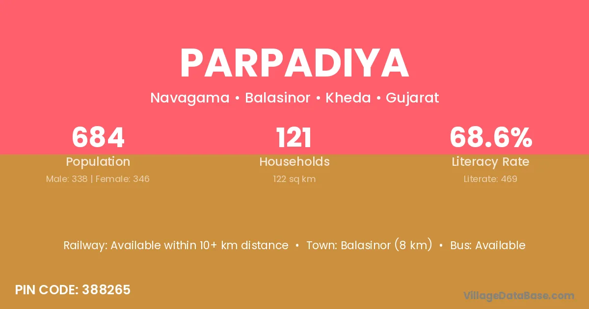 Balasinor (8 km) is the nearest town to Parpadiya village for major economic activities and is located approximately 8 km away.