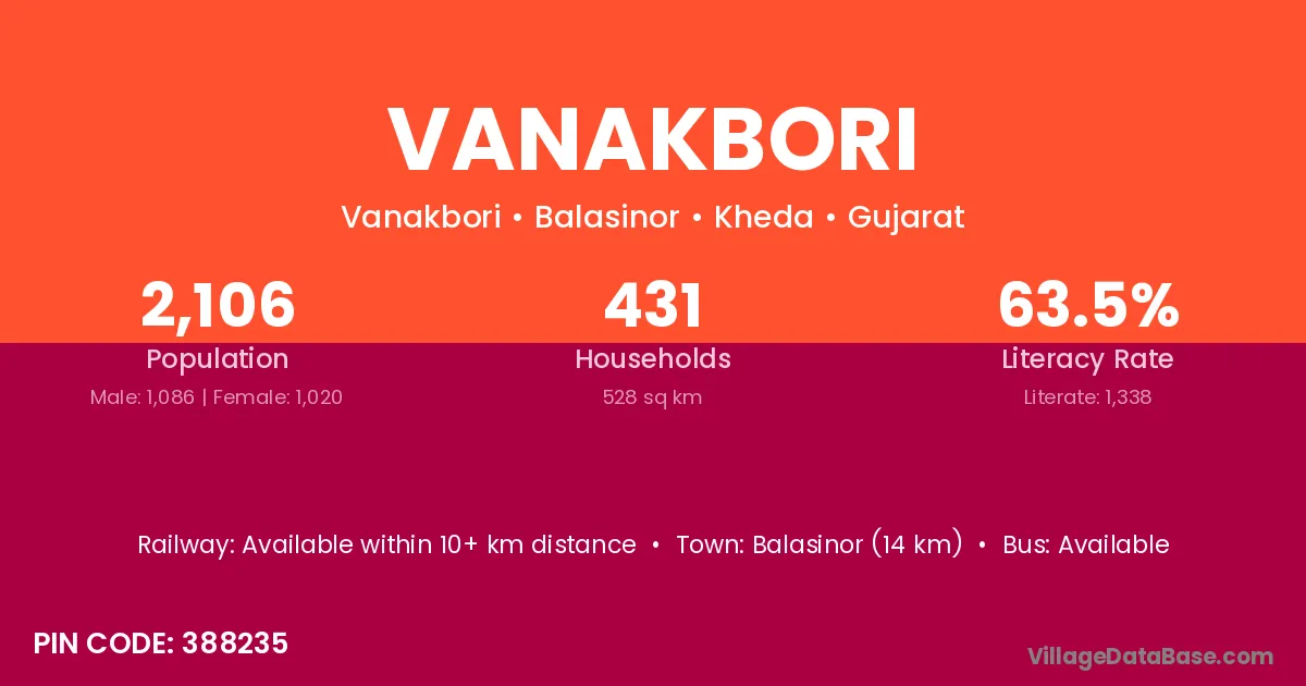 Balasinor (14 km) is the nearest town to Vanakbori village for major economic activities and is located approximately 14 km away.