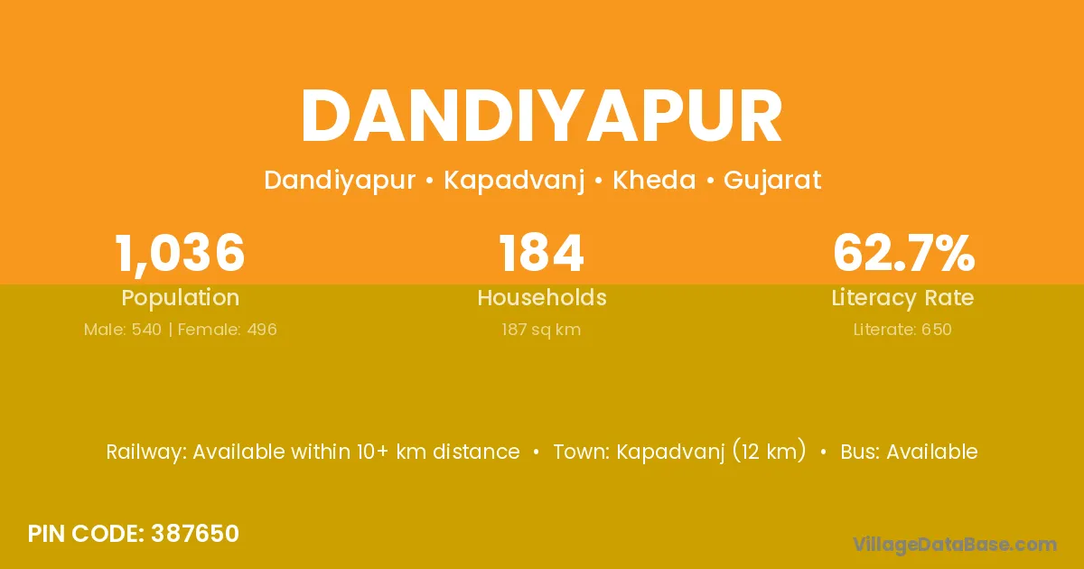Kapadvanj (12 km) is the nearest town to Dandiyapur village for major economic activities and is located approximately 12 km away.