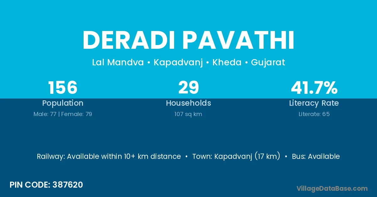 Kapadvanj (17 km) is the nearest town to Deradi Pavathi village for major economic activities and is located approximately 17 km away.