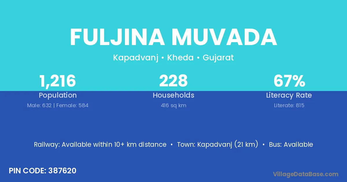 Fuljina Muvada village has a total population of 1,216 people, of which 632 are males and 584 are females.