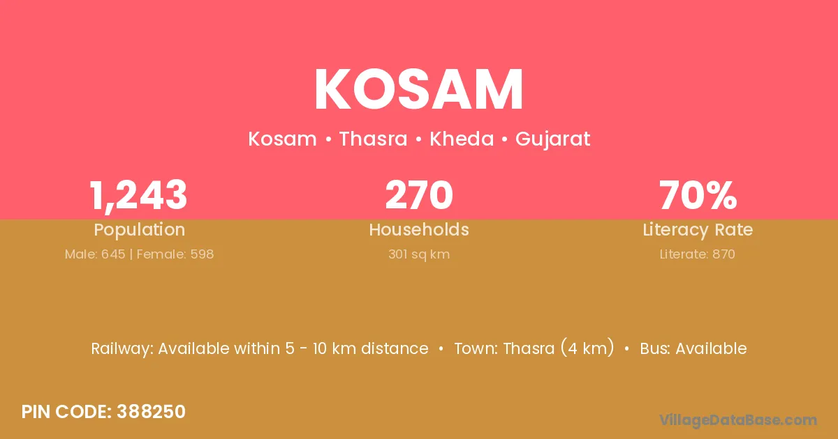 Kapadvanj (15 km) is the nearest town to Kosam village for major economic activities and is located approximately 15 km away.