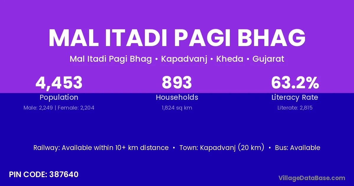 Kapadvanj (20 km) is the nearest town to Mal Itadi Pagi Bhag village for major economic activities and is located approximately 20 km away.