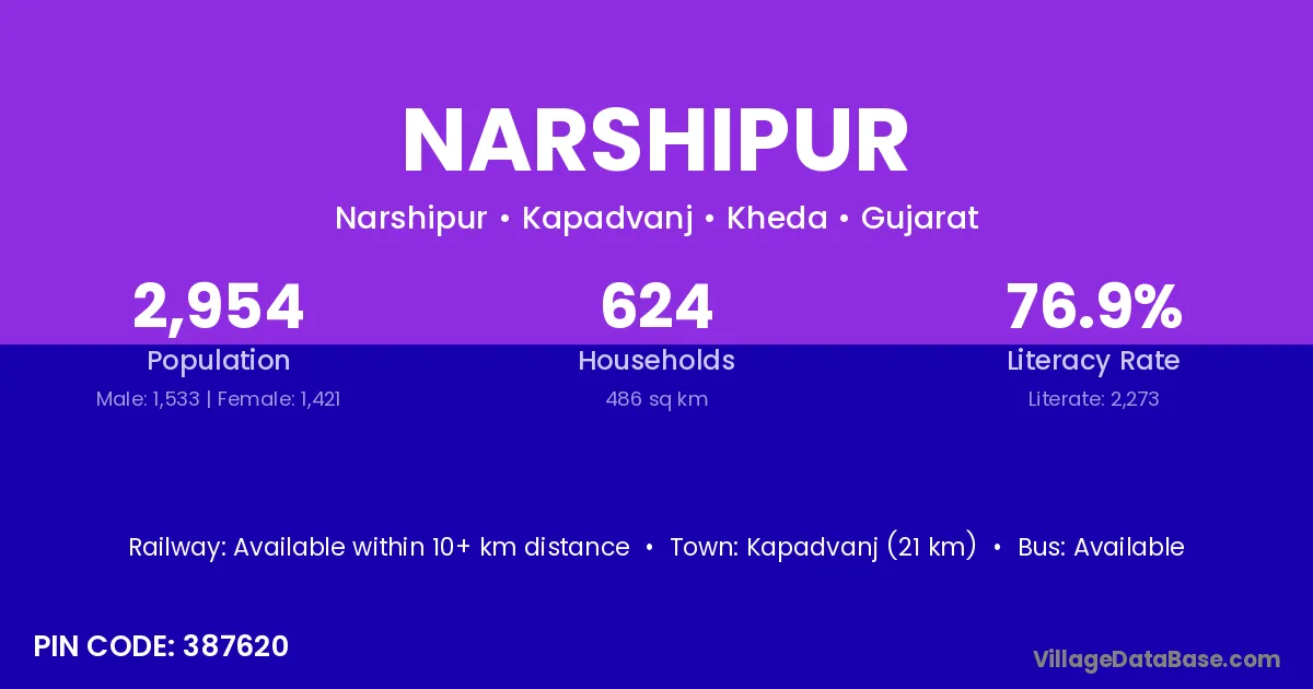 Kapadvanj (21 km) is the nearest town to Narshipur village for major economic activities and is located approximately 21 km away.
