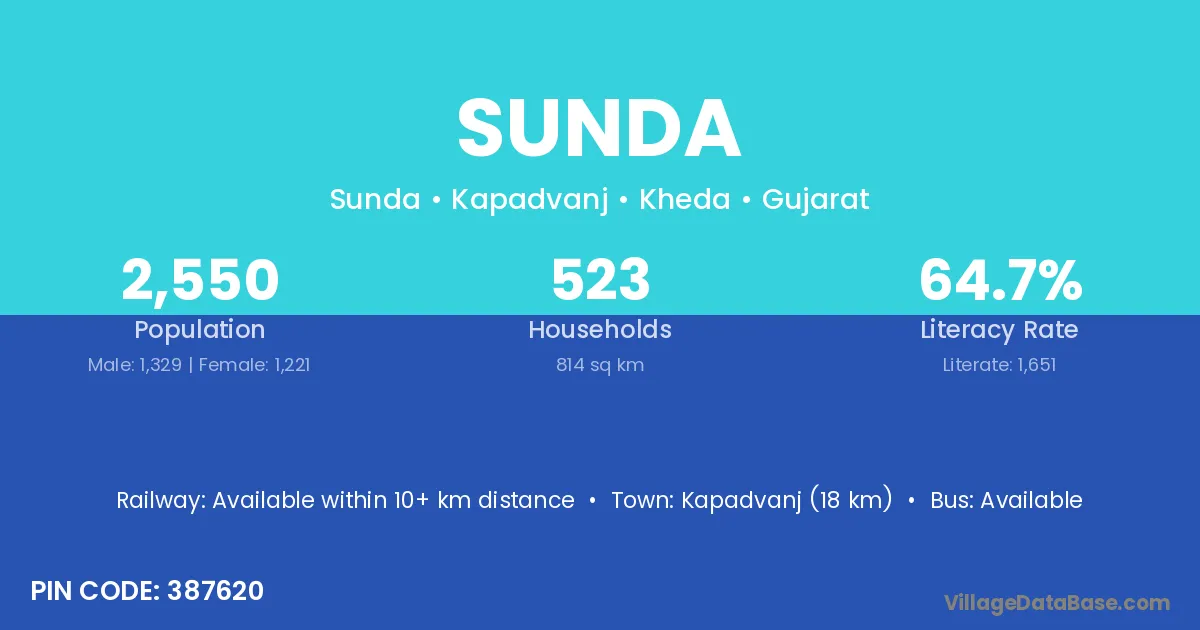 Kapadvanj (18 km) is the nearest town to Sunda village for major economic activities and is located approximately 18 km away.