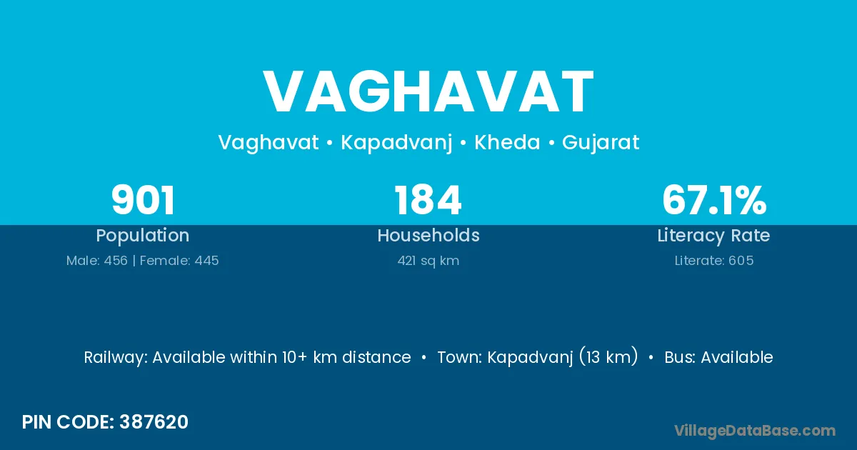 Kapadvanj (13 km) is the nearest town to Vaghavat village for major economic activities and is located approximately 13 km away.